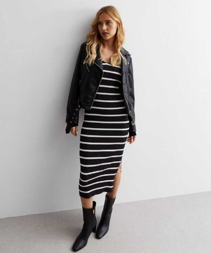 Shop this Black Stripe Knit V Neck Midi Dress for the perfect date night outfit. Pair it with some chunky boots and a black jacket and you are good to go! Available for £25.