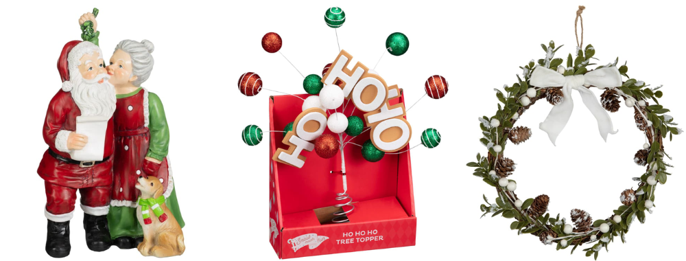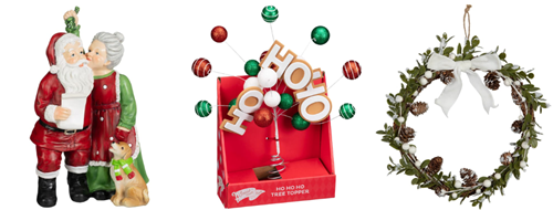 (Left to right: Festive Folklore Mr & Mrs Claus Misteltoe Ornament - £7.00, Snow Much Fun ‘Ho Ho Ho’ Tree Topper - £8.00, Hanging Christmas Wreath with Foliage - £6.00)