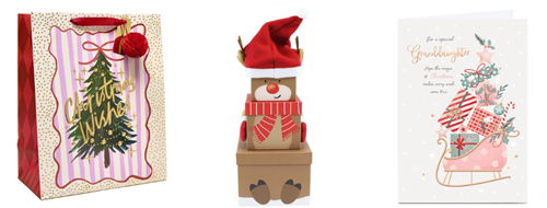 (Left to right: Christmas Wishes Large Portrait Gift Bag - £1.99, Plush Reindeer Gift Boxes - £6.99, Granddaughter Christmas Card - £1.99)