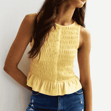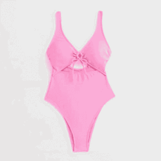 Left to right: Light Yellow Shirred Button Detail Sleeveless Top (£15.99), Bright Pink Knot Front Cutout Swimsuit (£30.99), White Fruit Print Scalloped Strap Midi Dress (£37.99)